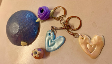 Jedes Kind entscheidet was es machen möchte z.B. einen Anhänger, ein Figürchen oder eine kleine Schale etc. Die Sachen können selber modelliert oder mit einer Silikonform geformt werden. Farbwahl, Misch- und Marmorierungstechniken ermöglichen viele verschiedene Varianten. Der Kreativität sind keine Grenzen gesetzt. Wir verwenden Reliefstempel, schimmernde Pigmente sowie Acryl-Malstifte für die Verzierung.